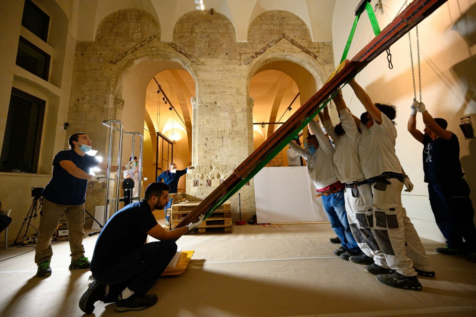 Prima dell’allestimento, è stato eseguito il restauro conservativo delle superfici calpestabili, articolato su quattro tipologie materiche: