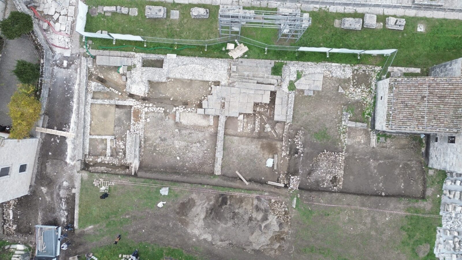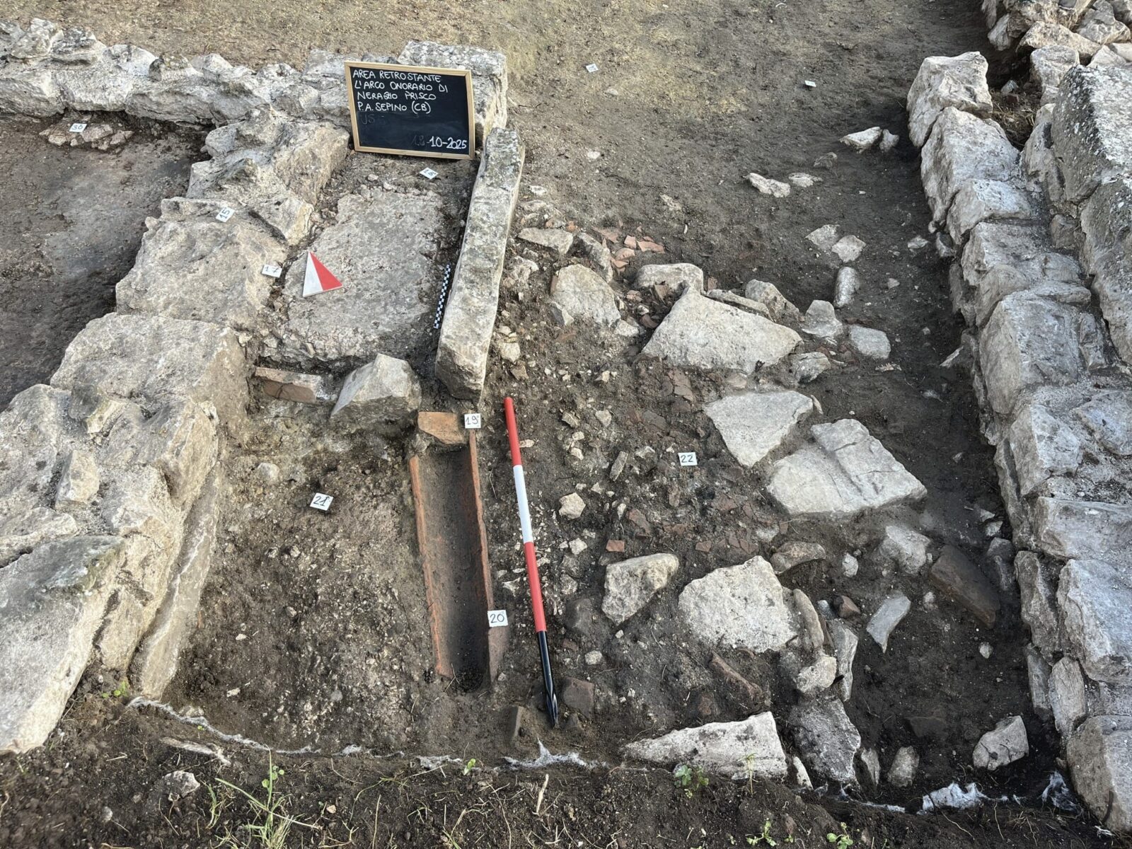 Tra settembre e dicembre 2025, la nostra azienda ha condotto una significativa campagna di scavo archeologico presso il Parco Archeologico di Sepino, nell’area retrostante l’arco onorario di Nerazio Prisco. Le indagini hanno permesso di documentare fasi edilizie precedenti alla monumentalizzazione del Foro, restituendo preziosi dati sulla topografia antica del sito.