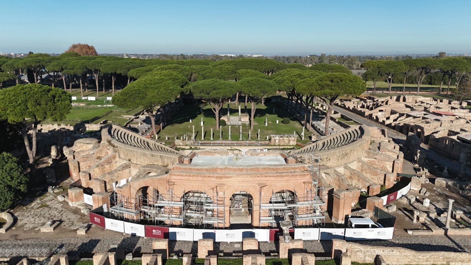 L’intervento presso il Teatro di Ostia Antica mira al risanamento delle superfici architettoniche e al contrasto dei fenomeni di infiltrazione, garantendo la conservazione di uno dei siti più iconici dell’area archeologica.